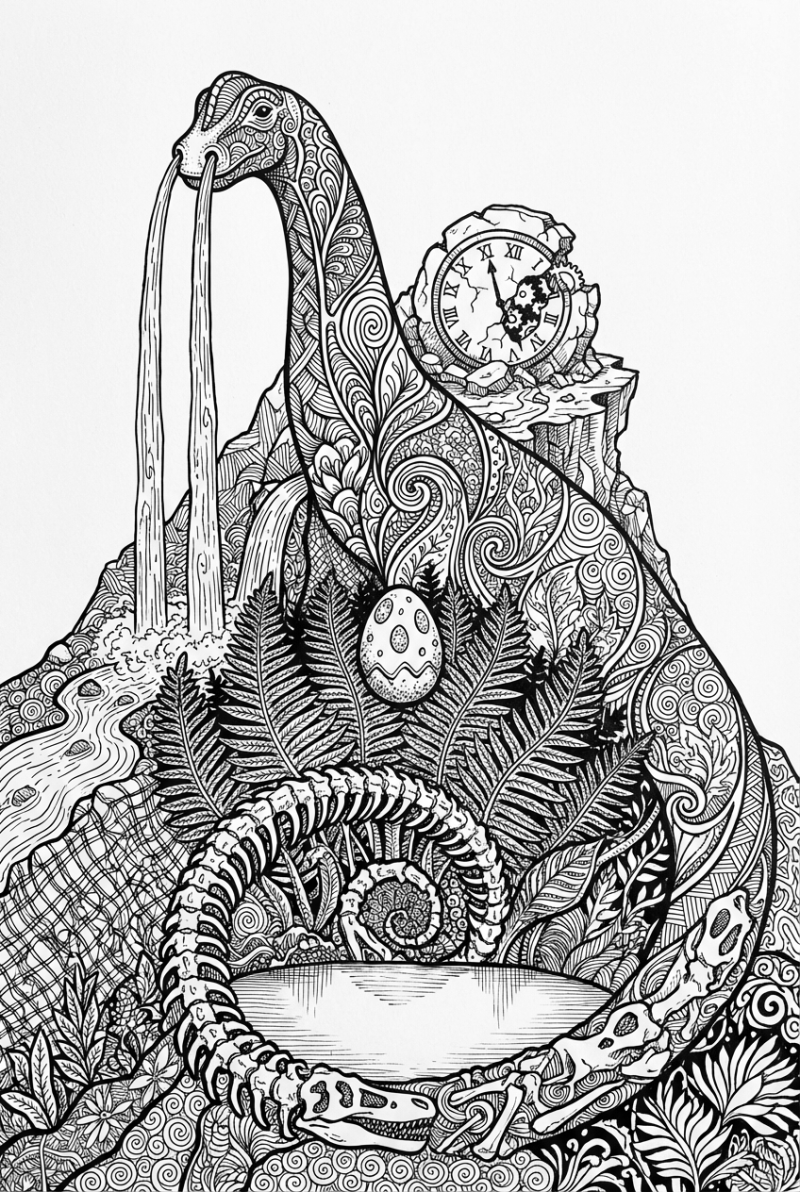Take a look at a massive mountain that’s shaped like a brachiosaurus. Its long neck rises up, and water streams out of its nostrils like little waterfalls. A broken stone clock sits on a flat plateau next to the peak, frozen in time. Below, a grove of huge ferns holds a hovering dinosaur egg in the crook of their fronds, and a spiraling arch made of fossilized bone shards frames a perfectly still lake.