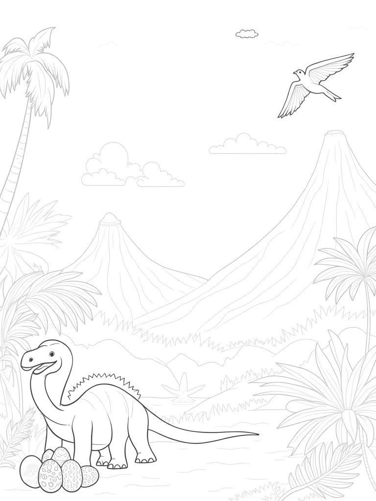Imagine stepping into a lush prehistoric jungle where gigantic ferns and cycads tower all around. In the foreground, a friendly brontosaurus bends its long neck to munch on some leaves from a colossal tree. Nestled at its feet are vibrant, patterned eggs, ready to hatch. Just above, a playful pterodactyl soars through the fluffy clouds, its wings outstretched like a superhero in the sky. And in the distance, a volcano quietly releases gentle plumes of smoke, surrounded by rolling hills and rocky outcrops.