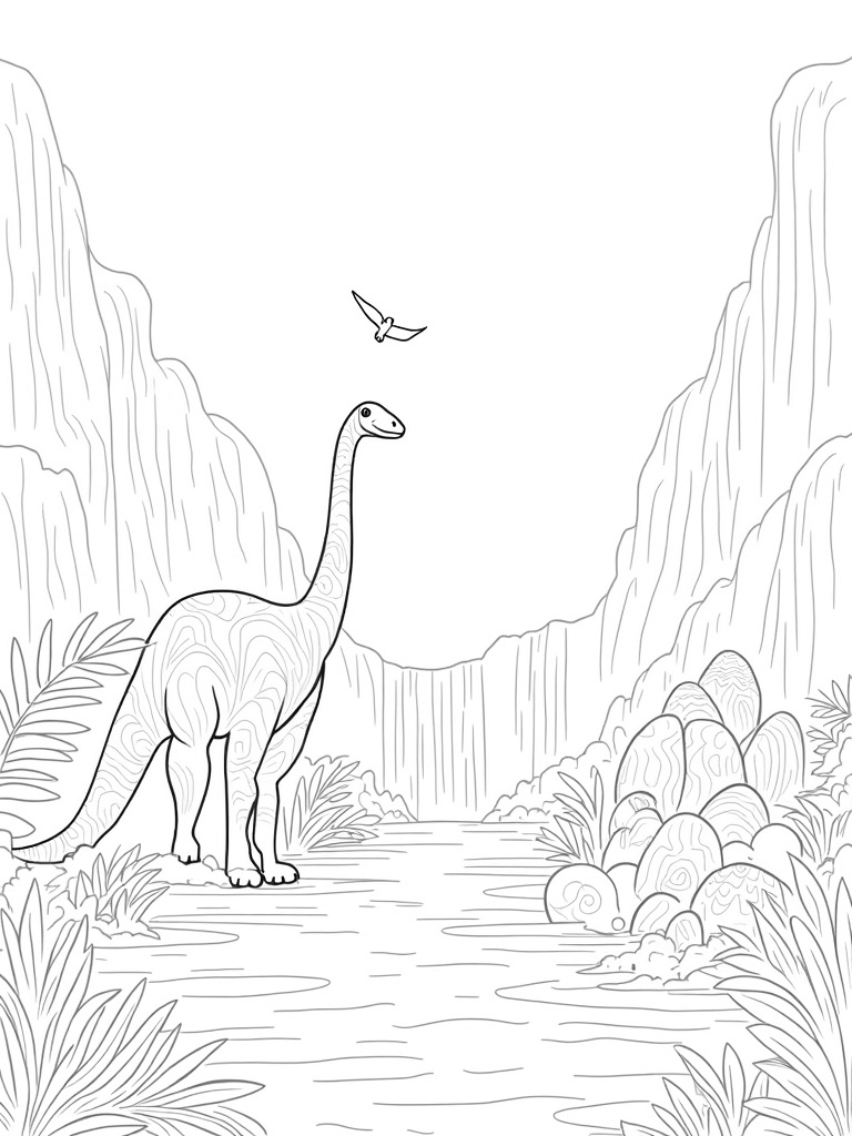 Imagine stepping into a vibrant prehistoric jungle filled with towering ferns and a winding river! Right by the water, a gentle brontosaurus stretches its long neck to munch on the highest treetops. Nearby, you’ll spot some colorful, egg-shaped boulders tucked away in the underbrush, each with its own unique patterns. Above, a playful pterosaur glides effortlessly between two jagged cliffs, its wings outstretched as it soars through the clear sky.