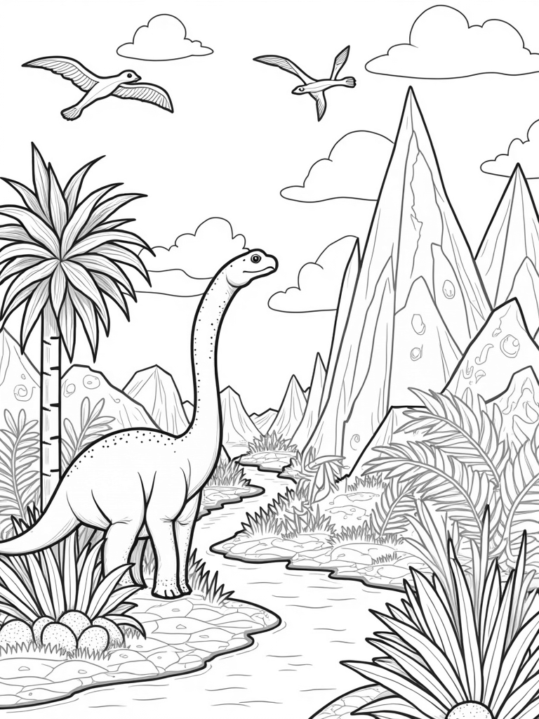 Look up and you’ll see graceful pterodactyls gliding through the air, their wings spread wide against a backdrop of fluffy, oversized clouds. They bring a sense of movement to the picture, adding a lively touch to this prehistoric scene. It’s a delightful mix of colors just waiting for your imagination!