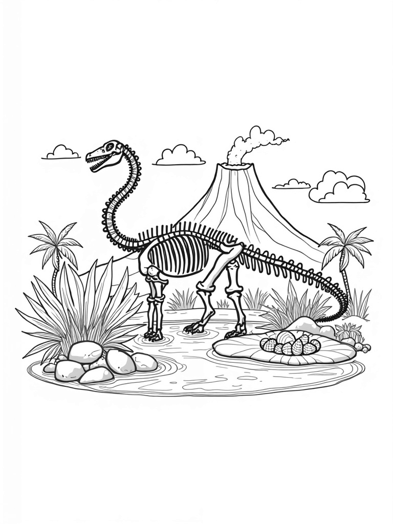 Colossal Dinosaur Skeleton in a Prehistoric Landscape Coloring Page