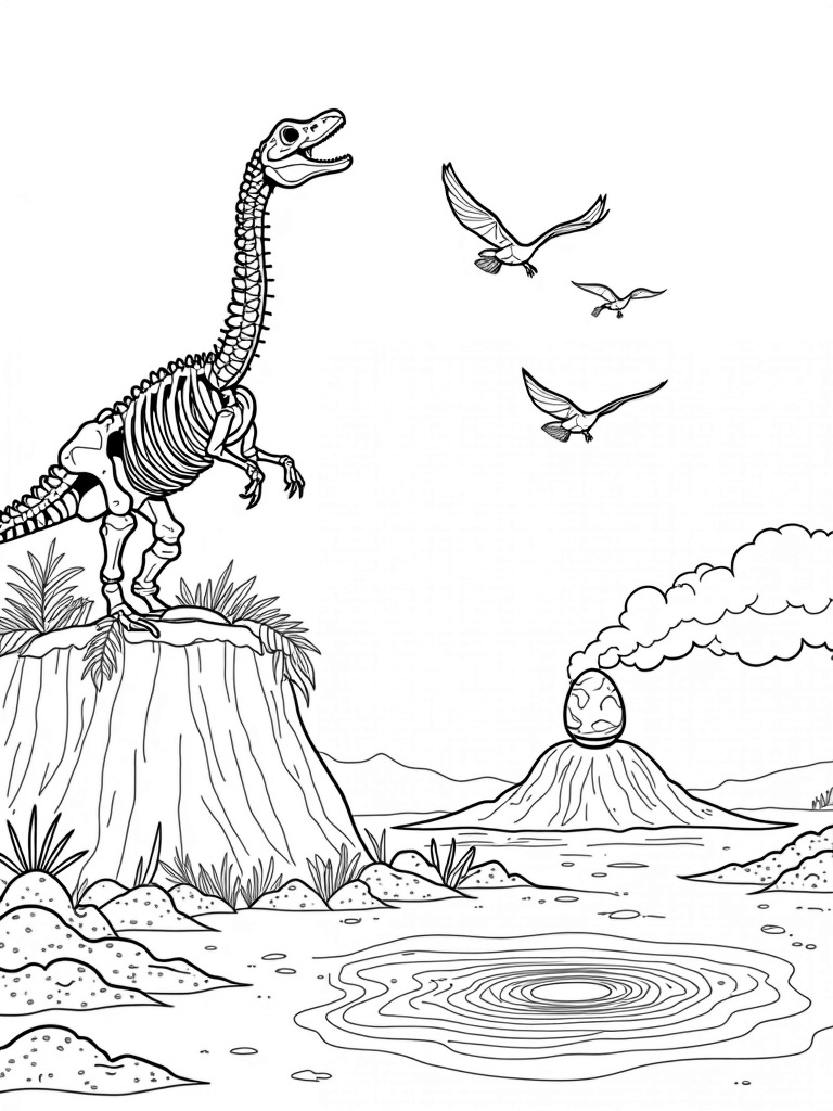 A massive dinosaur skeleton bursts forth from a rocky cliffside, its ancient bones intertwined with colorful ferns and creeping vines. Just nearby, there’s a giant egg resting on a beautifully polished stone pedestal, featuring intricate patterns that make you wonder what might hatch from it! In the foreground, a trail of colorful footprints leads to a bubbling volcanic spring, with steam rising in soft swirls, adding a touch of mystery to the scene. And don't forget to look up—three pterosaurs are soaring through the sky, their wings spread wide against a backdrop of swirling clouds.
