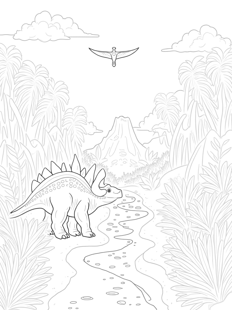 This scene is packed with life and color! In the center, a majestic stegosaurus stands tall, its unique plates ready to be filled with all sorts of colors. Surrounding it are towering ferns and huge cycads, creating a lush, green atmosphere. You can even spot some gentle wisps of smoke coming from a nearby volcanic rock formation, which adds a hint of mystery to the jungle!
