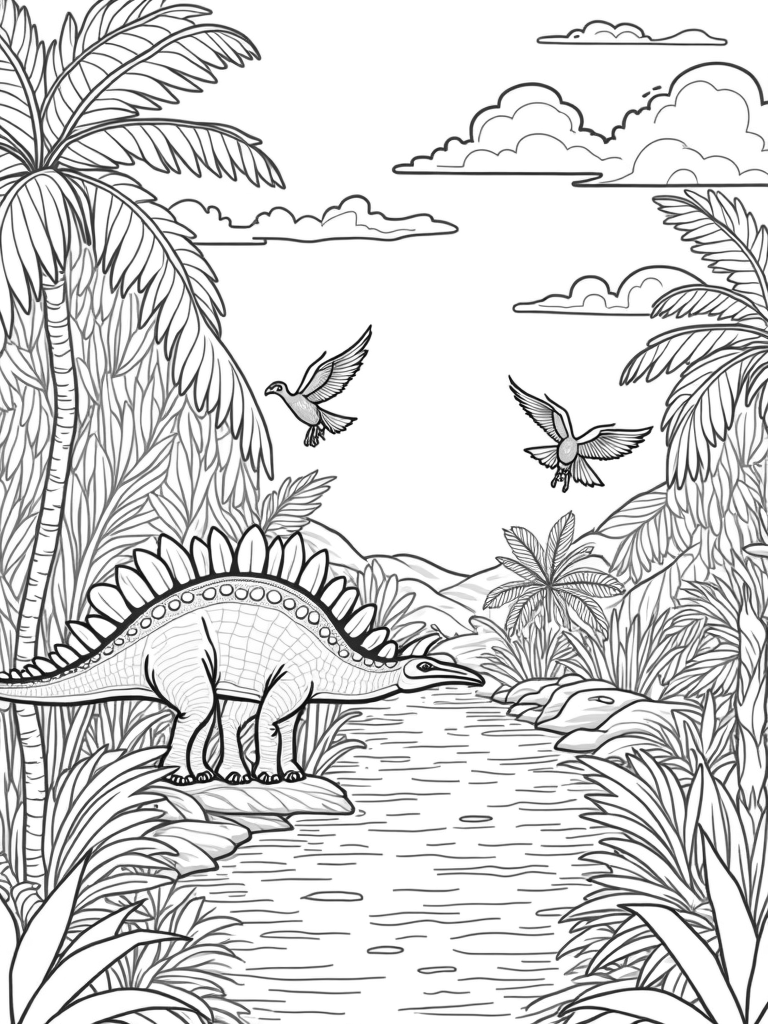 Colossal Stegosaurus in a Prehistoric Jungle Coloring Page