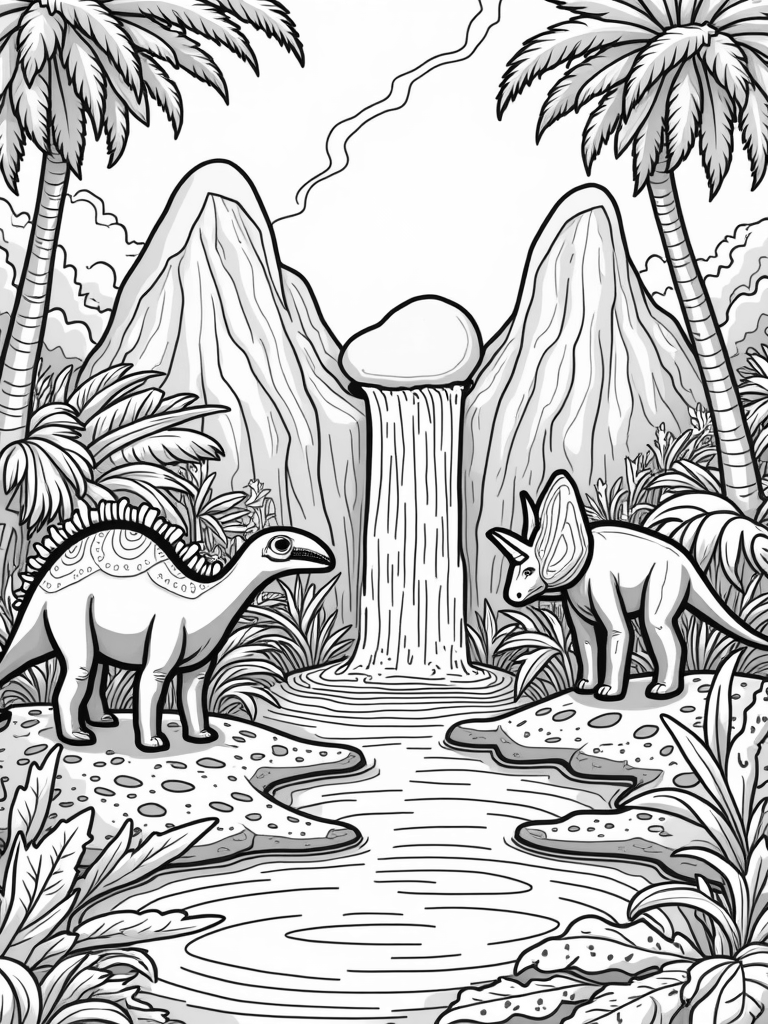As you color, look out for the dinosaur footprints scattered across the lush ground. They create a winding path that tells a story of adventure in this prehistoric paradise. Imagine the sounds of the jungle and the splash of the waterfall while you bring this colorful scene to life. Every detail, from the towering ferns to the colossal volcanic rocks, is waiting for your creative touch!