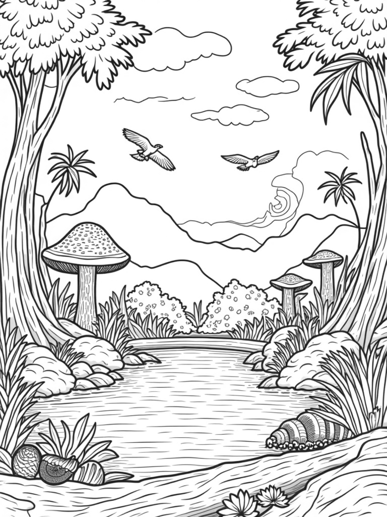 Look up! A trio of pterosaurs are soaring through the clouds, their wings spread wide as they glide effortlessly. Can you imagine how cool it would be to fly like them? And don’t forget about the giant segmented insect creeping along a fallen tree trunk in the foreground. Its intricate shell is just waiting for your crayons to bring it to life!