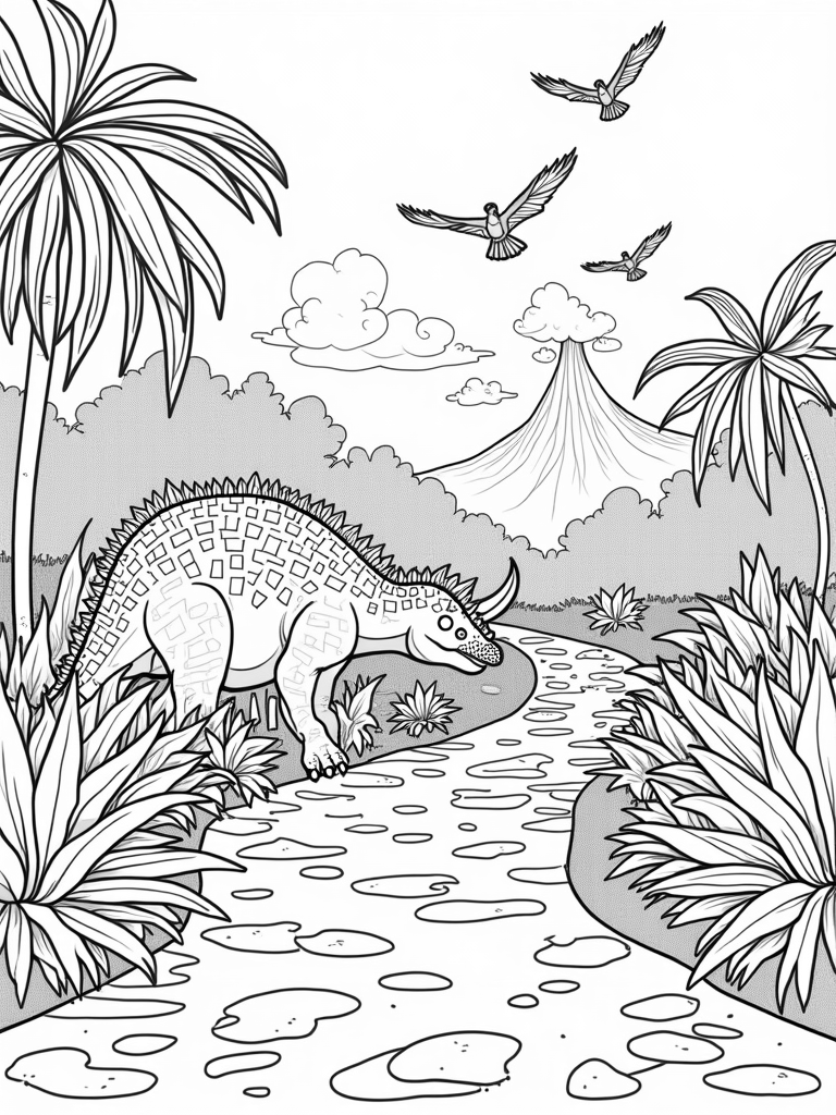 Dinosaur Footprints in a Prehistoric Jungle Coloring Page