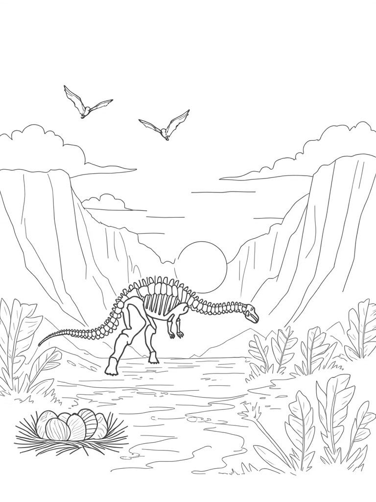 Dinosaur Skeleton and Volcanic Landscape Coloring Page
