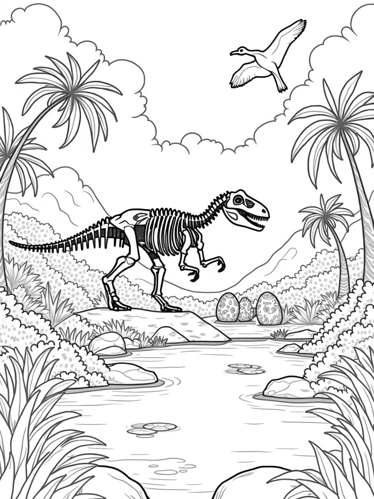 Dinosaur Skeleton in a Prehistoric Jungle Coloring Page