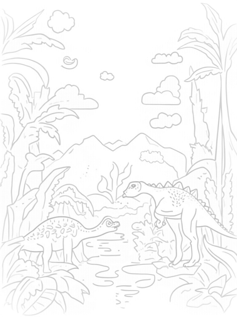 High above, pterodactyls are soaring against a backdrop of fluffy clouds and distant mountains. They look so free as they glide through the swirling sky! You’ll also notice oversized dinosaur footprints leading toward a sparkling river that winds through the entire scene. It’s like a dino paradise waiting to be colored in!