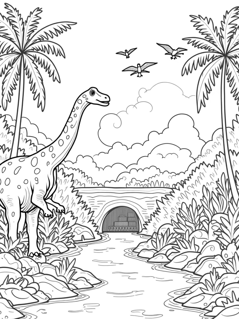 Look closely, and you’ll see some bright dinosaur footprints leading towards a hidden cave. What could be inside? Maybe ancient carvings or treasures from the past! And there’s a sparkling river winding through the scene, perfect for splashing around or imagining what it was like for dinosaurs to drink from it. Color in the river with shades of blue and the jungle with all your favorite greens!