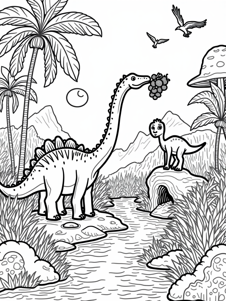 Friendly Dinosaurs in a Colorful Prehistoric Jungle Coloring Page
