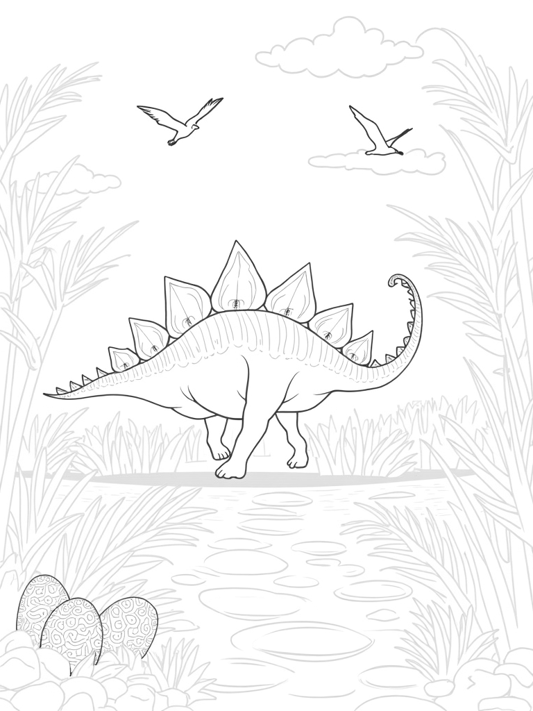 This scene brings to life a vibrant prehistoric jungle filled with towering ferns that look like giant hands reaching out. In the center, a massive stegosaurus stands proudly, its colorful plates resembling a string of kites. Nearby, a winding river sparkles with oversized pebbles, just waiting for some imaginative colors. You can also spot a cozy cluster of patterned eggs nestled in soft moss, adding a touch of mystery to this lively setting. And don't forget the pterosaurs soaring above, their wings spread wide against the swirling clouds!