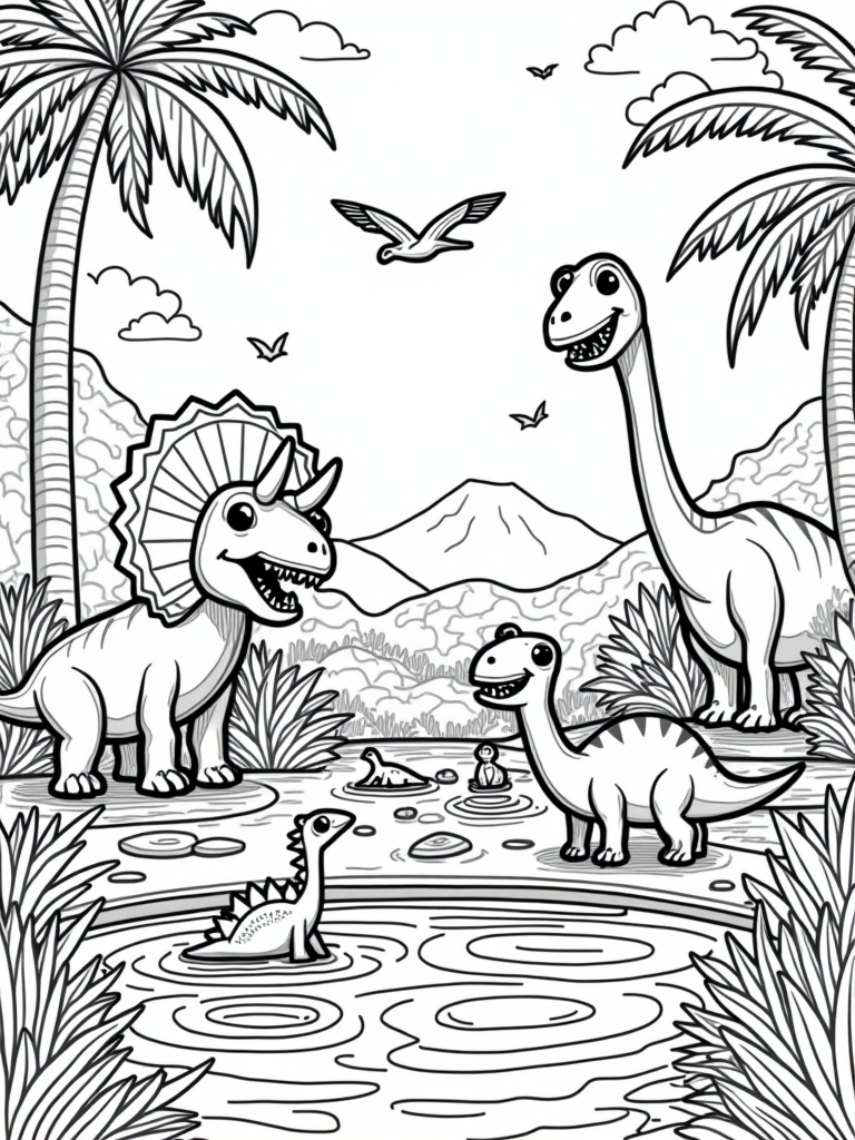 Playful Dinosaurs in a Prehistoric Jungle Coloring Page