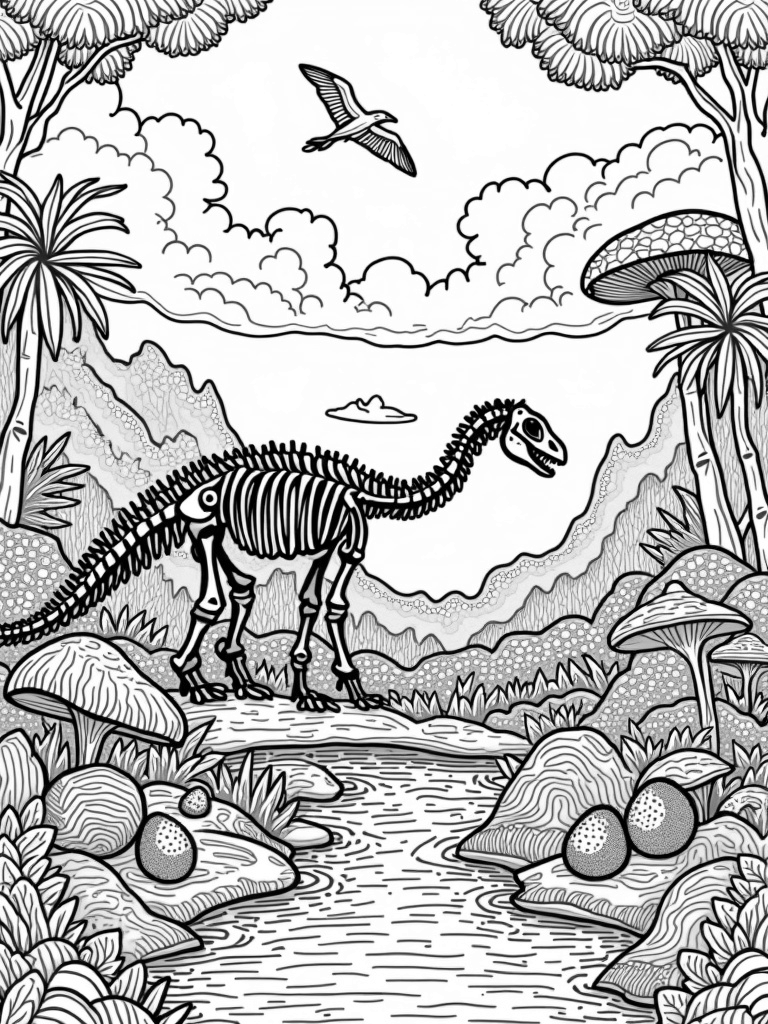 While you color, think about what colors you want to use for the dinosaur skeleton. Would it look cool in bright colors, or should it stay natural? You can also get creative with the giant eggs—try out different patterns or even add your own designs! And don’t forget the sky! Pterodactyls are flying above, so you might want to color them in vibrant shades to make them pop against the fluffy clouds.