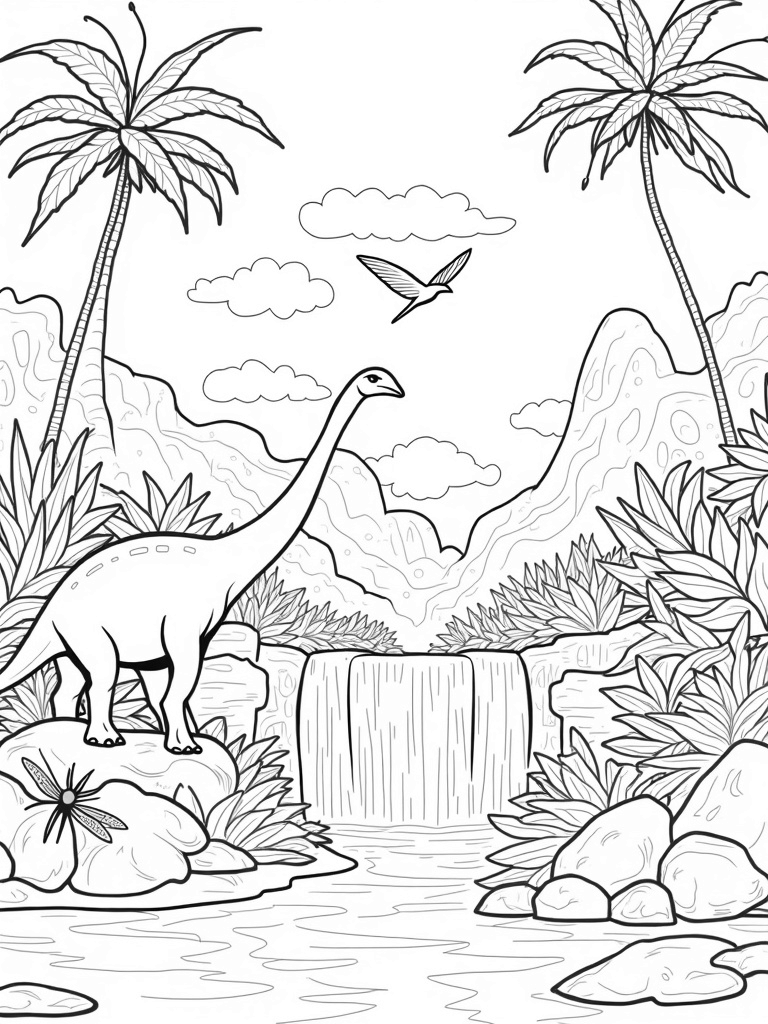 Prehistoric Jungle with Brontosaurus and Pterodactyls Coloring Page