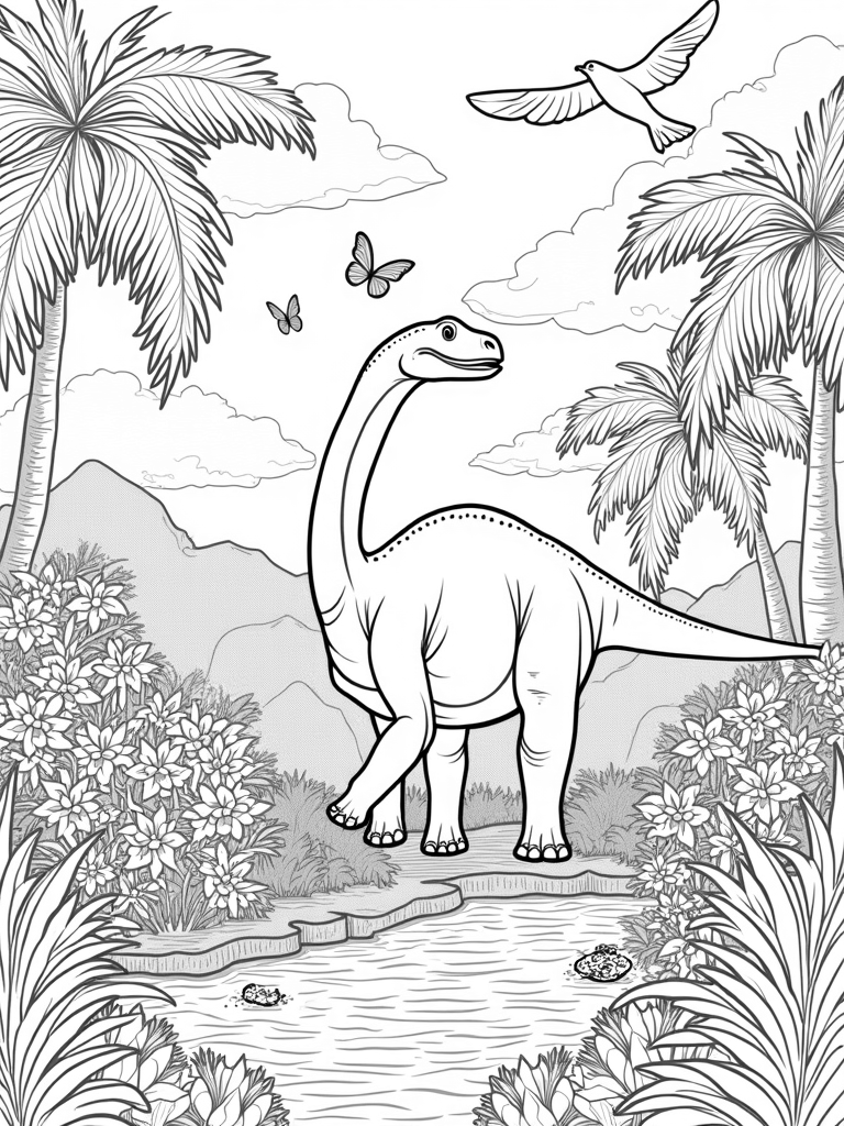If you peek closely among the ferns and palm trees, you might discover a nest of speckled eggs tucked beneath a mossy rock. It’s like a little secret waiting to be uncovered! This scene is not only fun to color but also a great way to spark imagination about what life was like in the time of dinosaurs.