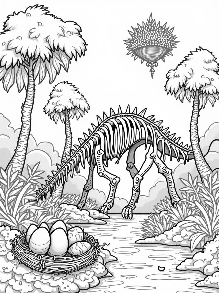 Check out this free, printable coloring page featuring a prehistoric jungle with a dinosaur skeleton, colorful eggs, and a floating island. Perfect for kids who love dinosaurs and nature!