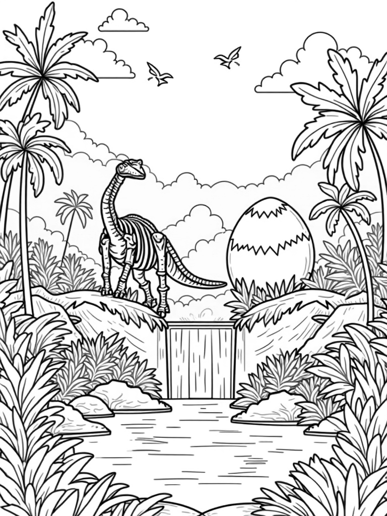 Prehistoric Jungle with Dinosaur Skeleton and Glowing Egg Coloring Page