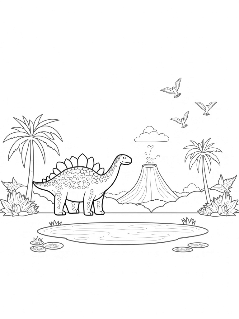 This coloring page invites young artists to use their imagination and creativity. Kids can fill the stegosaurus's plates with bold colors or choose soft pastels for the tranquil pond. The ferns can be painted in shades of green, or even in wild colors just for fun! Whether it's realistic or rainbow-colored, every choice makes this prehistoric scene unique.