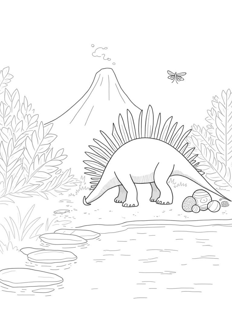 This coloring page showcases a vibrant prehistoric jungle filled with giant ferns and towering cycads. At the center, a massive stegosaurus munches on some leaves, its colorful plates fanned out like a spiky rainbow. Nearby, you can spot a sandy nest with a cluster of beautifully patterned eggs resting snugly, waiting to hatch. A volcano looms in the background, puffing gentle smoke rings into the sky, adding a little drama to the scene.