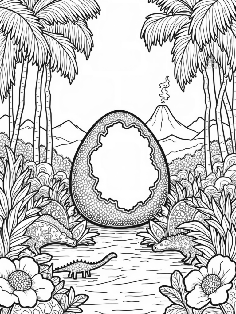 Prehistoric Jungle with Tiny Dinosaurs and a Cracked Egg Coloring Page