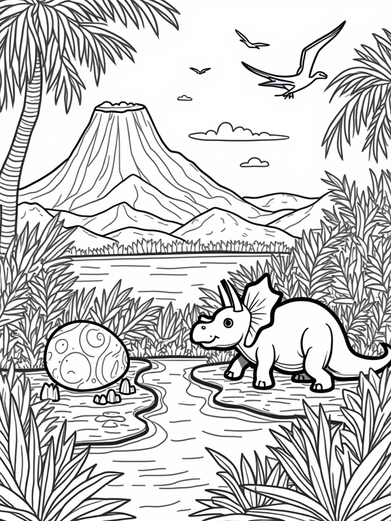 Check out this free, printable coloring page featuring a prehistoric jungle with a triceratops, pterodactyls, and a giant dinosaur egg. Perfect for kids who love dinosaurs and coloring!