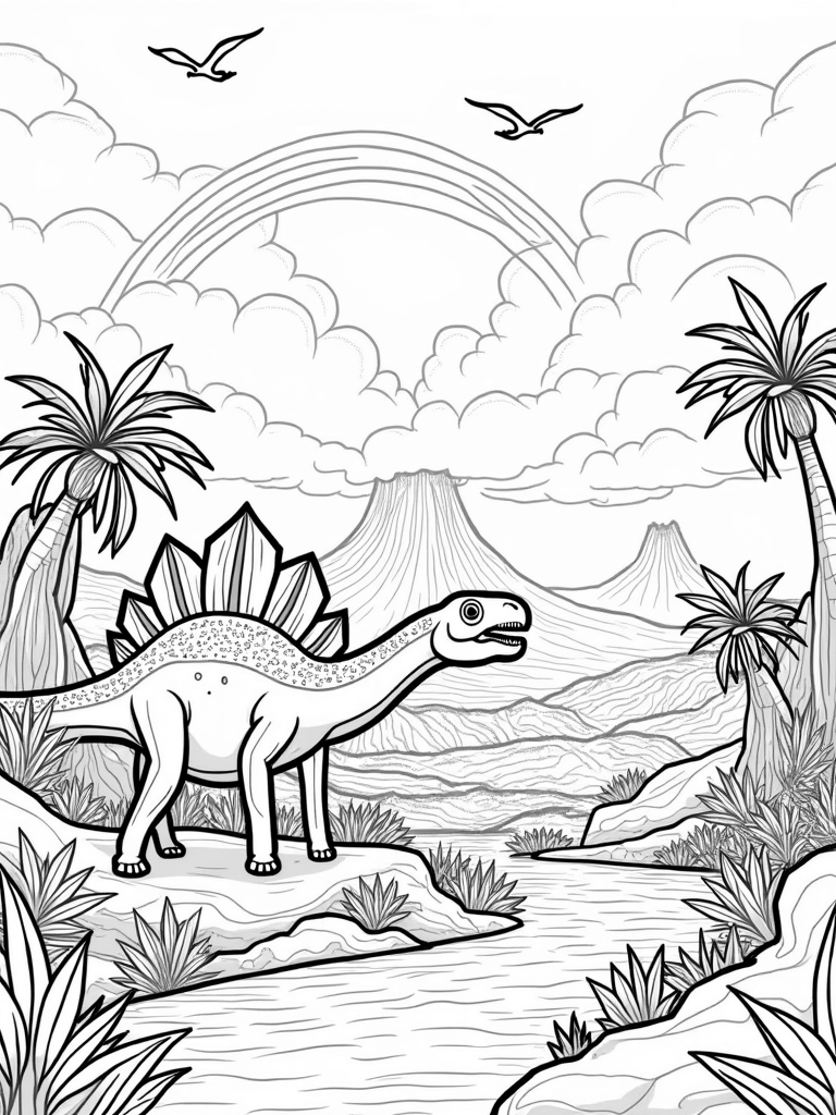 Look up and you’ll see pterodactyls gliding gracefully through the sky, which is filled with fluffy clouds that are playfully shaped like dino footprints! And if you peek into the distance, a cluster of volcanoes is softly smoking, framed by a rainbow that adds a burst of color to this prehistoric paradise. These elements make it a fun and imaginative scene for any young artist!