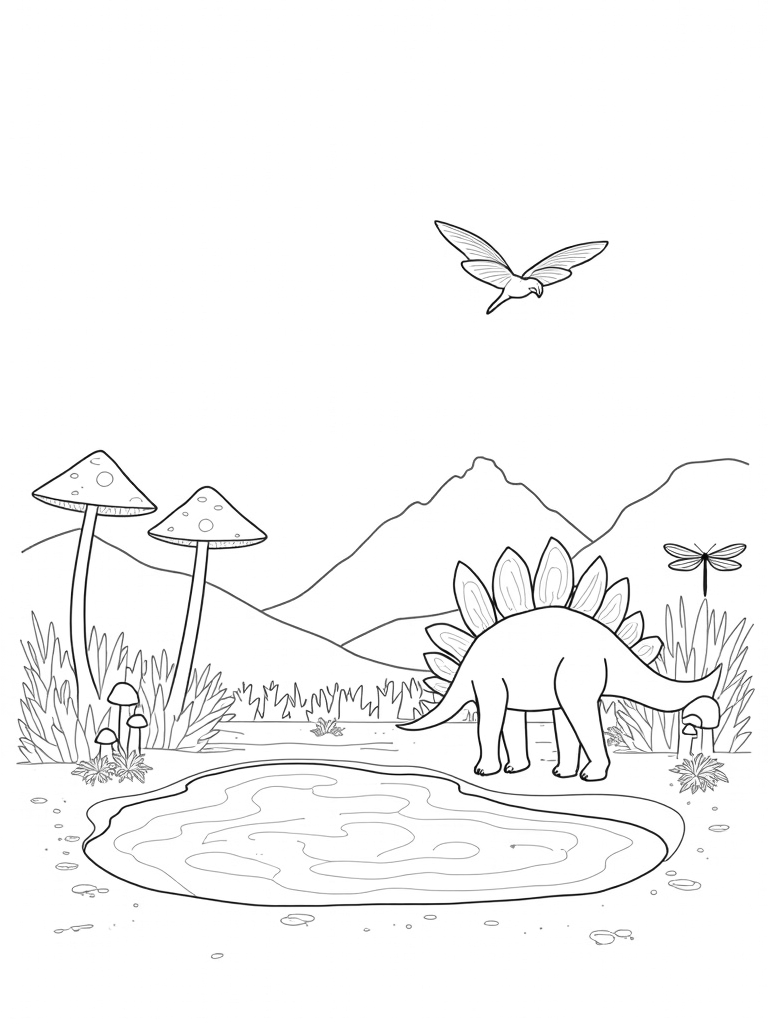 Stegosaurus by the Bubbling Hot Spring in a Prehistoric Jungle Coloring Page