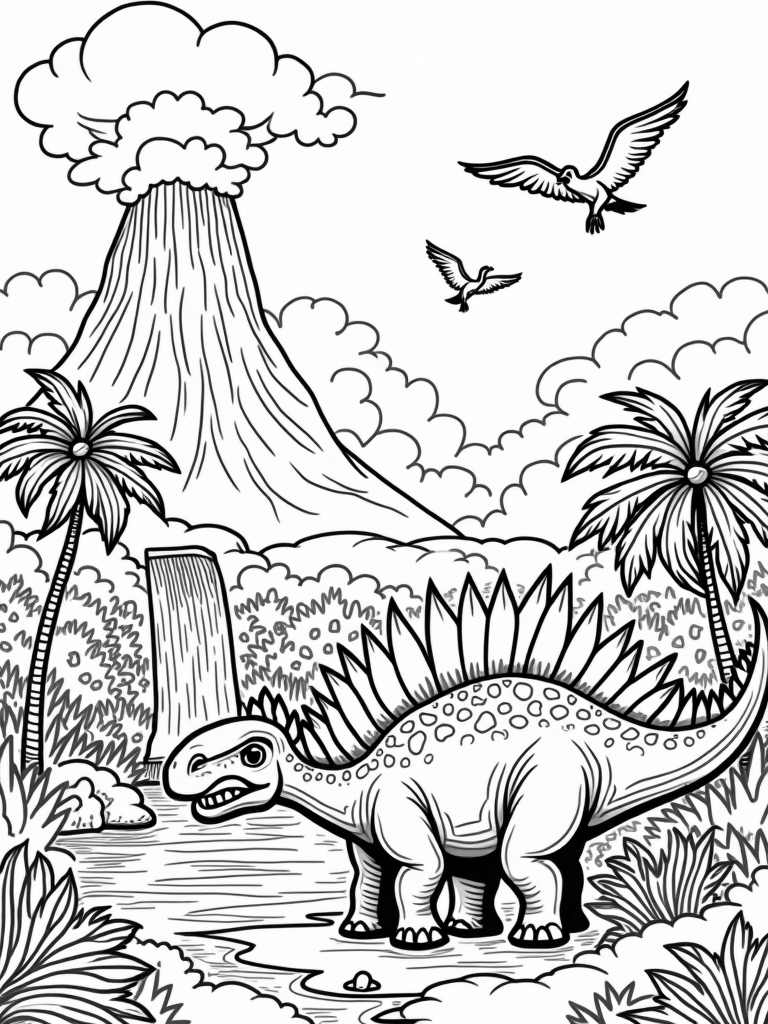In this vibrant prehistoric jungle, a massive stegosaurus stands proudly, its unique plates just waiting for your favorite colors. Nearby, a volcano gently puffs out smoke, adding a little drama to the scene. Below, a beautiful waterfall flows into a serene pool, perfect for a splash!