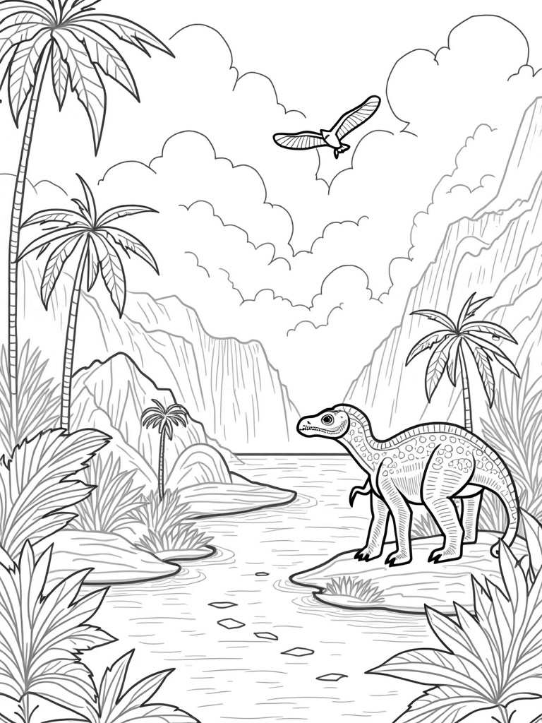 In the backdrop, a stunning waterfall cascades down into a serene lagoon, mirroring the bright, leafy jungle above. The swirling clouds add a dramatic touch to the sky, making this prehistoric world feel alive. It’s a place where imagination can run wild, and kids can let their creativity flow as they bring this lush landscape to life with colors.