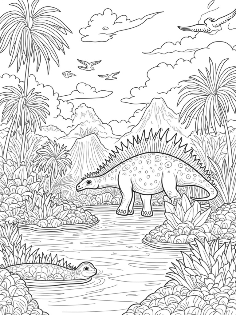 Look closely at the crystal-clear river nearby! You can spot a plesiosaurus gliding gracefully through the water, its vibrant scales shimmering in the sunlight. Above it all, feathered pterosaurs soar between fluffy clouds, casting playful shadows on the ground. This jungle is full of life and ready to be filled with color!