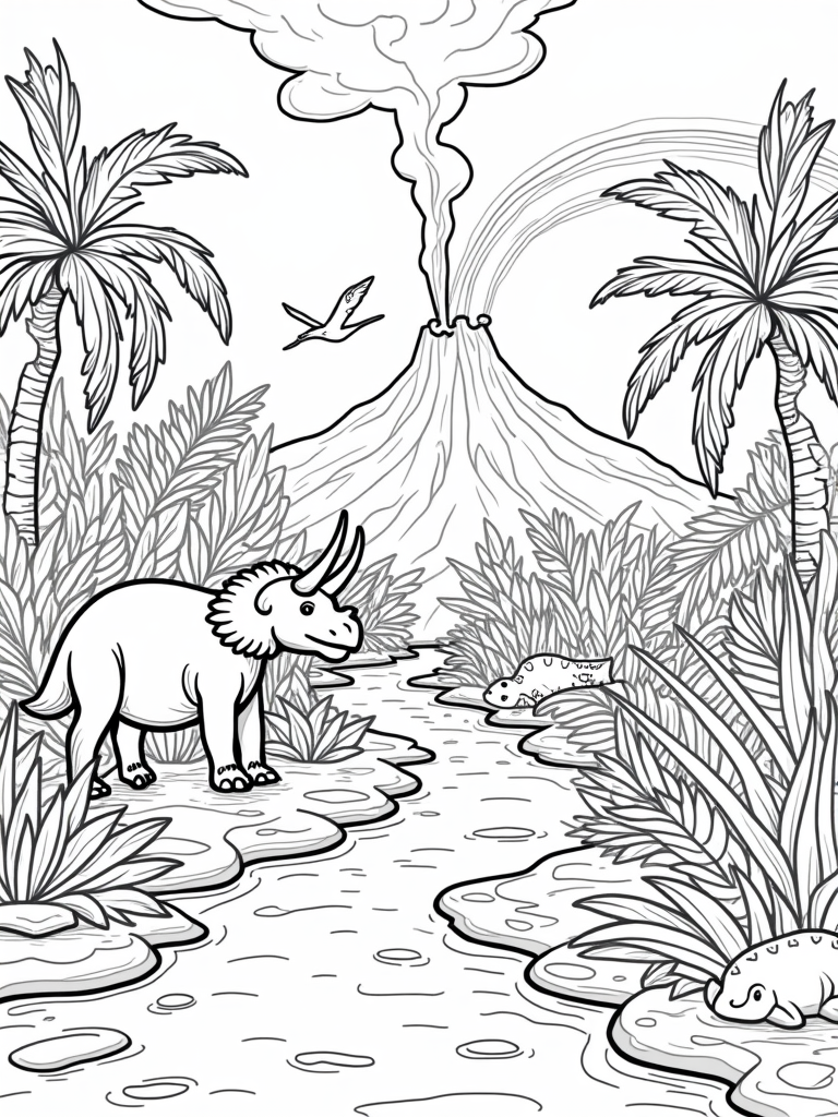 This free, printable coloring page features a triceratops, pterodactyl, and a lush dinosaur jungle. Perfect for young artists who love dinosaurs and adventures in nature!