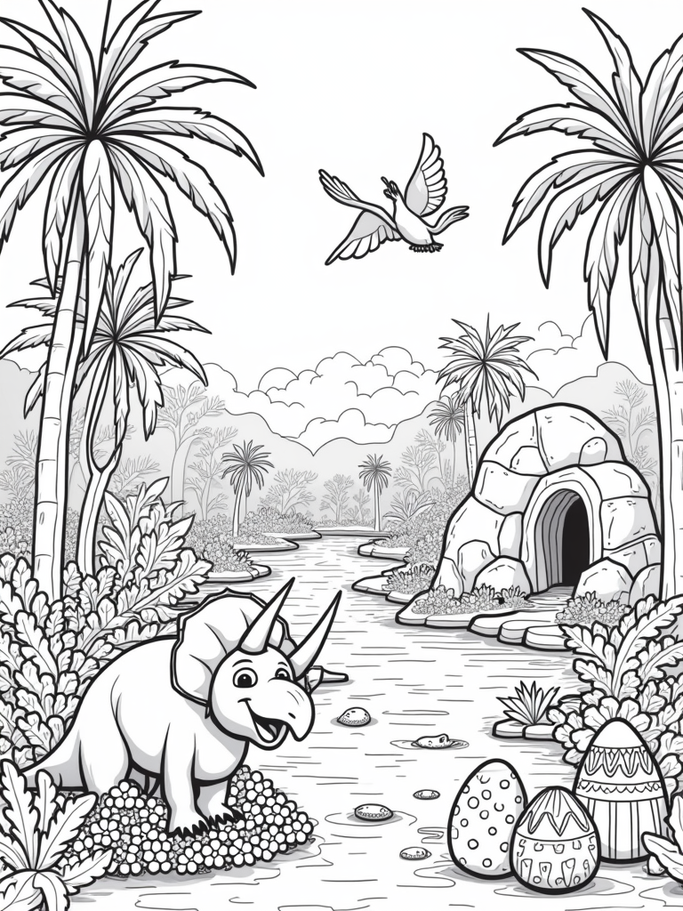 As you color, don’t forget to explore the scene for all the little details! A winding river sparkles nearby, filled with playful fish that are just waiting for your colorful touch. And check out the cozy cave entrance nestled behind a boulder—it's decorated with ancient cave paintings of dinosaurs! You can even find oversized dinosaur eggs scattered throughout, each one boasting unique patterns just begging for your creative flair.
