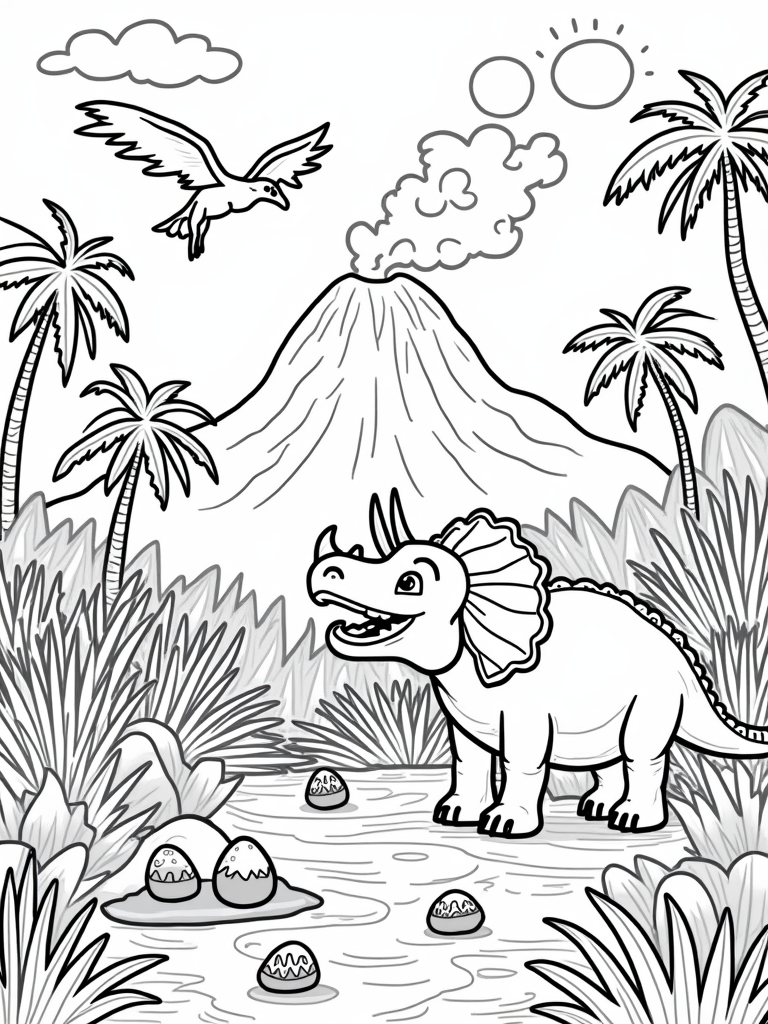 Check out this free, printable coloring page featuring a triceratops and a pterodactyl in a vibrant prehistoric jungle! Perfect for dinosaur lovers, it's a fun way to explore creativity while coloring in unique dinosaur eggs and a friendly volcano.
