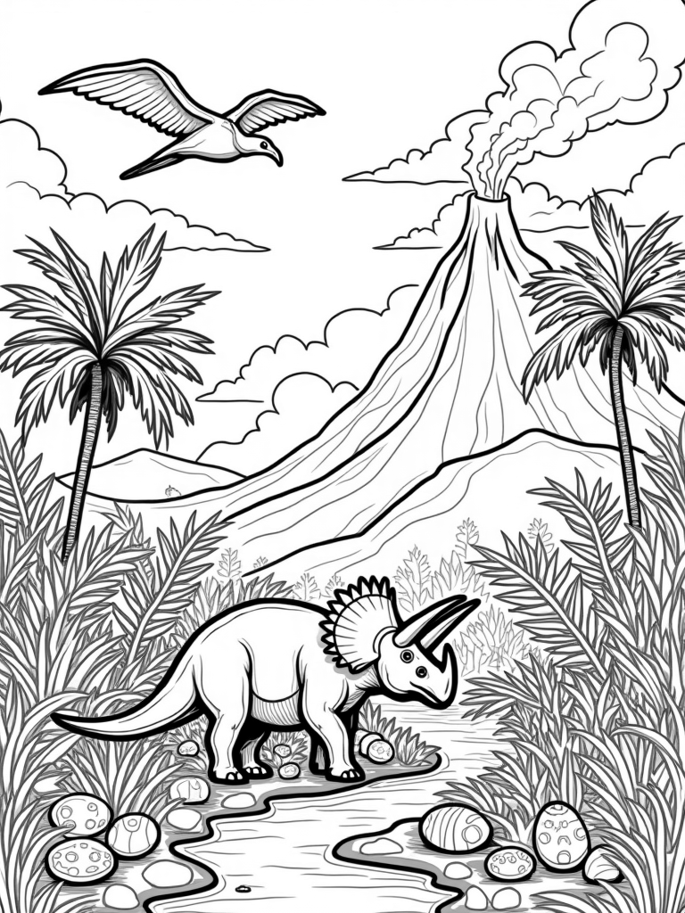 Triceratops and Pterodactyl in a Prehistoric Jungle Coloring Page