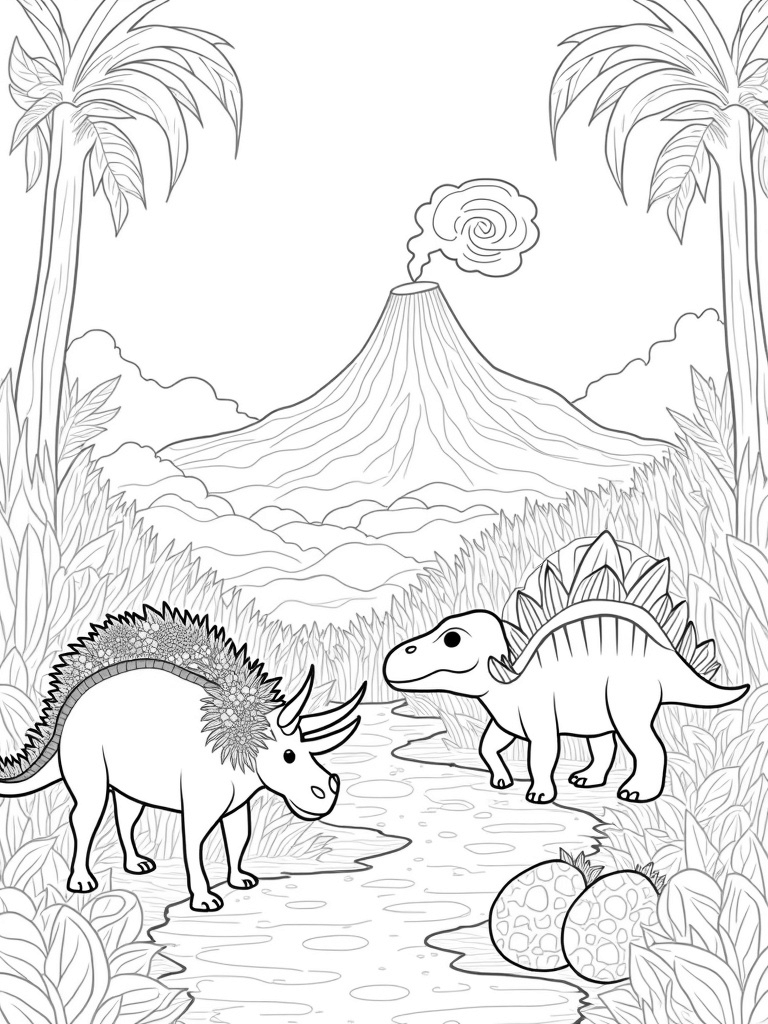 Check out this free, printable coloring page featuring dinosaurs in a vibrant prehistoric jungle! Perfect for kids who love to color, it showcases a triceratops with a flower crown and a stegosaurus by a bubbling brook.