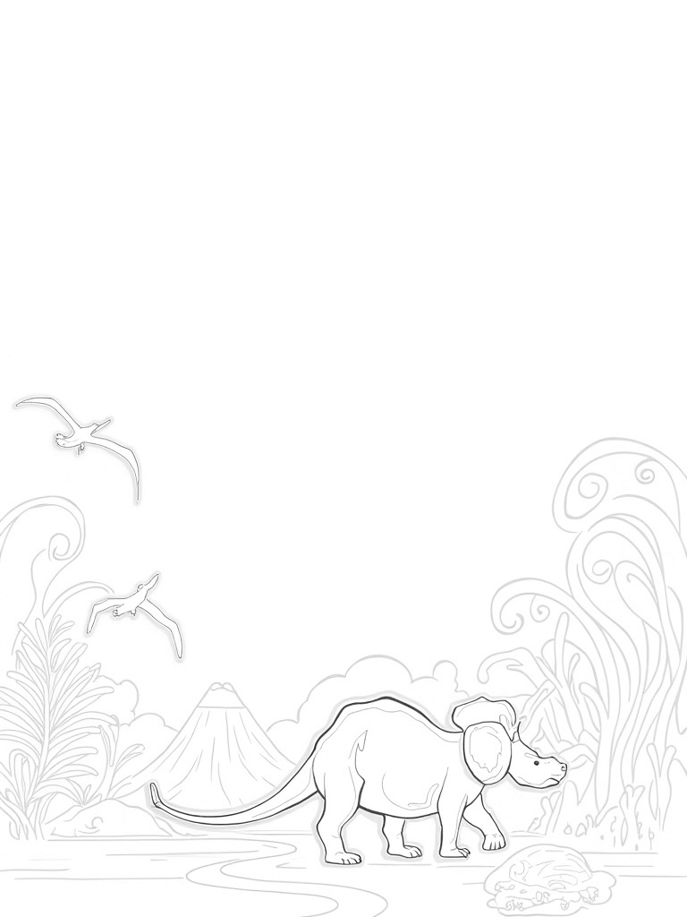 Not too far from our triceratops, there’s a rocky outcrop showcasing a glowing fossil that seems to sparkle with cool geometric shapes. And in the distance, a volcano stands tall, puffing out clouds of smoke that curl and twist into fun shapes. It’s a wild and exciting scene that captures the magic of dinosaurs and their natural habitat!