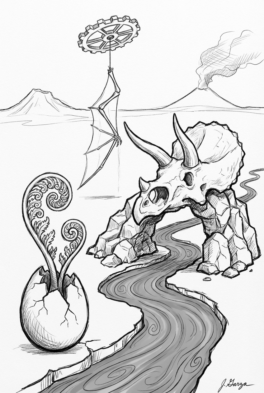 Look down at a rugged basalt plateau that’s holding up a gigantic triceratops skull like a natural arch. The three horns frame a winding river that looks like molten amber, and right next to it a massive fern frond shoots up from a cracked egg‑shaped stone, its leaves unfurling like ancient scrolls. Hovering above, a pterosaur wing is suspended from a floating gear, casting a thin shadow, while a lone volcano in the distance puffs out pale graphite smoke that sketches the horizon.