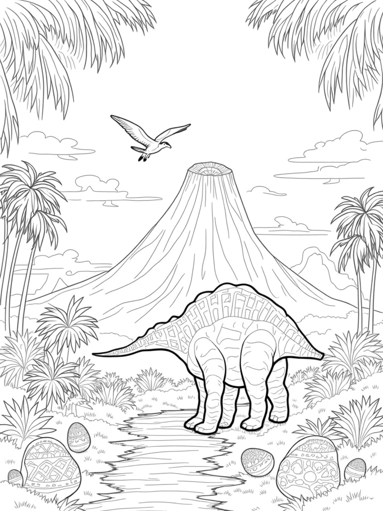 As you color, don't miss the oversized dinosaur eggs scattered around the scene! Each one is uniquely patterned and resting on a soft bed of moss, just waiting to be filled with color. In the distance, a dormant volcano peeks through the trees, with spiraling smoke plumes rising from its peak. It's a perfect spot for your imagination to run wild!