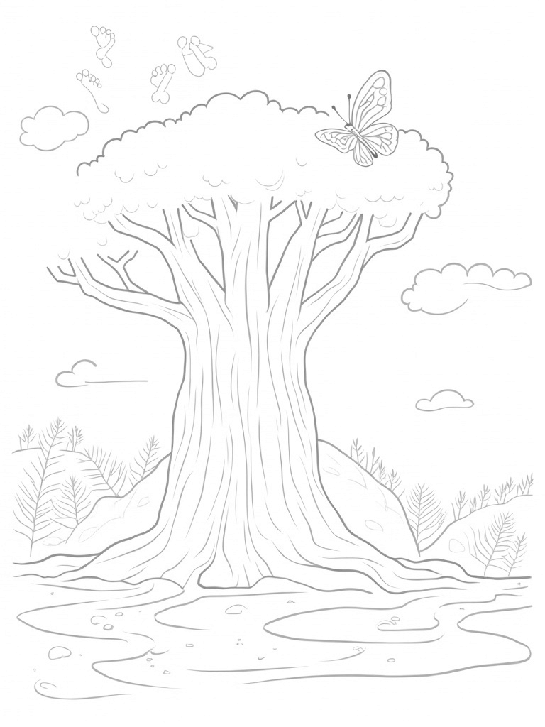 Ancient Tree with Dinosaur Footprints and Butterfly Coloring Page