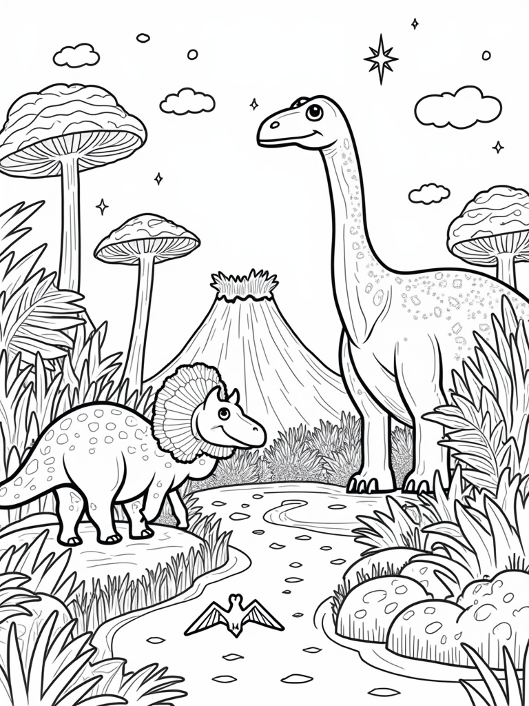 Grab your favorite crayons or markers and let your imagination run wild! You can color the ferns in bright greens, the mushrooms in all sorts of colors, and of course, the dinosaurs can be any shade you like. Maybe the brontosaurus will be a lovely lavender, or the triceratops a bold orange. There’s no limit to the fun you can have with this scene!