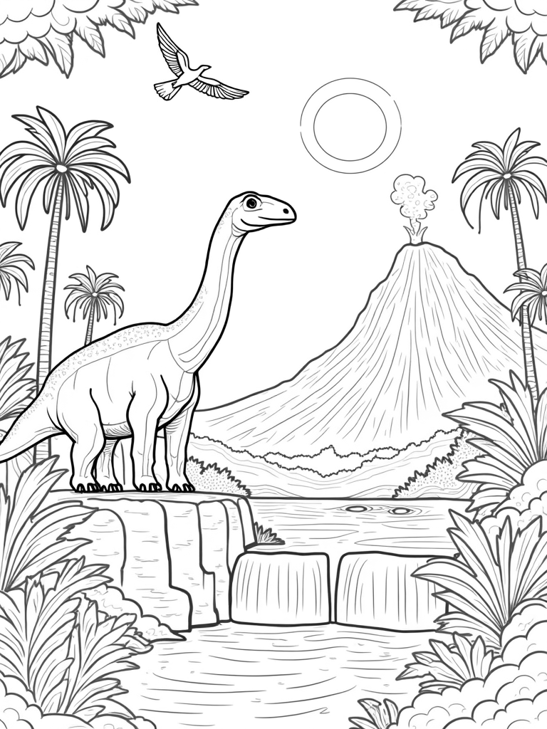 Brontosaurus and Pterodactyls in a Prehistoric Jungle Coloring Page