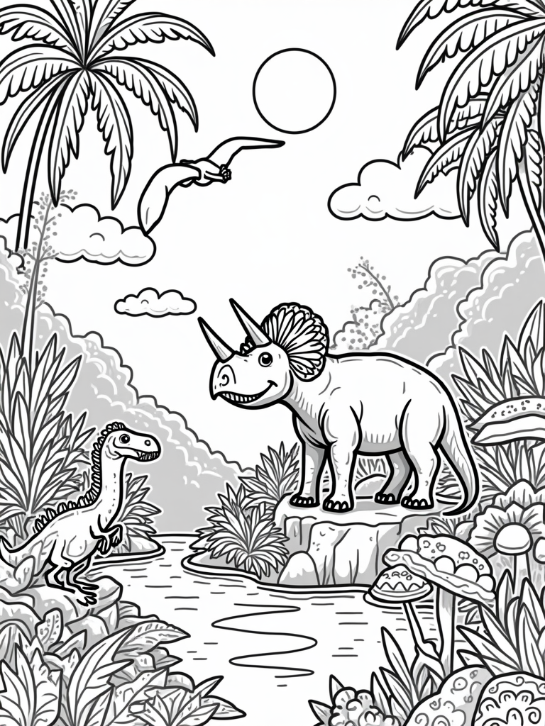 Check out this free, printable coloring page featuring dinosaurs! A cheerful triceratops and its friends are waiting for your favorite colors in this vibrant prehistoric jungle scene.