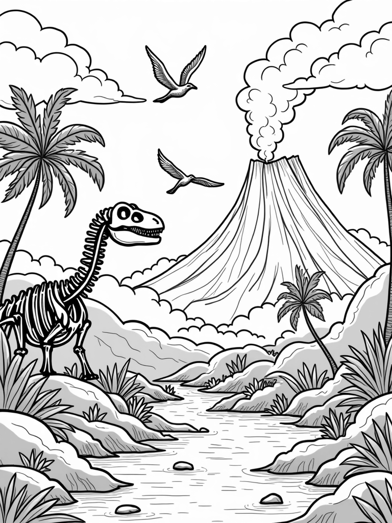 Beneath the dinosaur skeleton, a sparkling river winds its way through the landscape, dotted with smooth stones and ancient tree stumps. In the distance, a massive volcano looms, its peak shaped like a giant dinosaur egg, with steam gently billowing from the crater. It’s a perfect setting for some creative coloring!