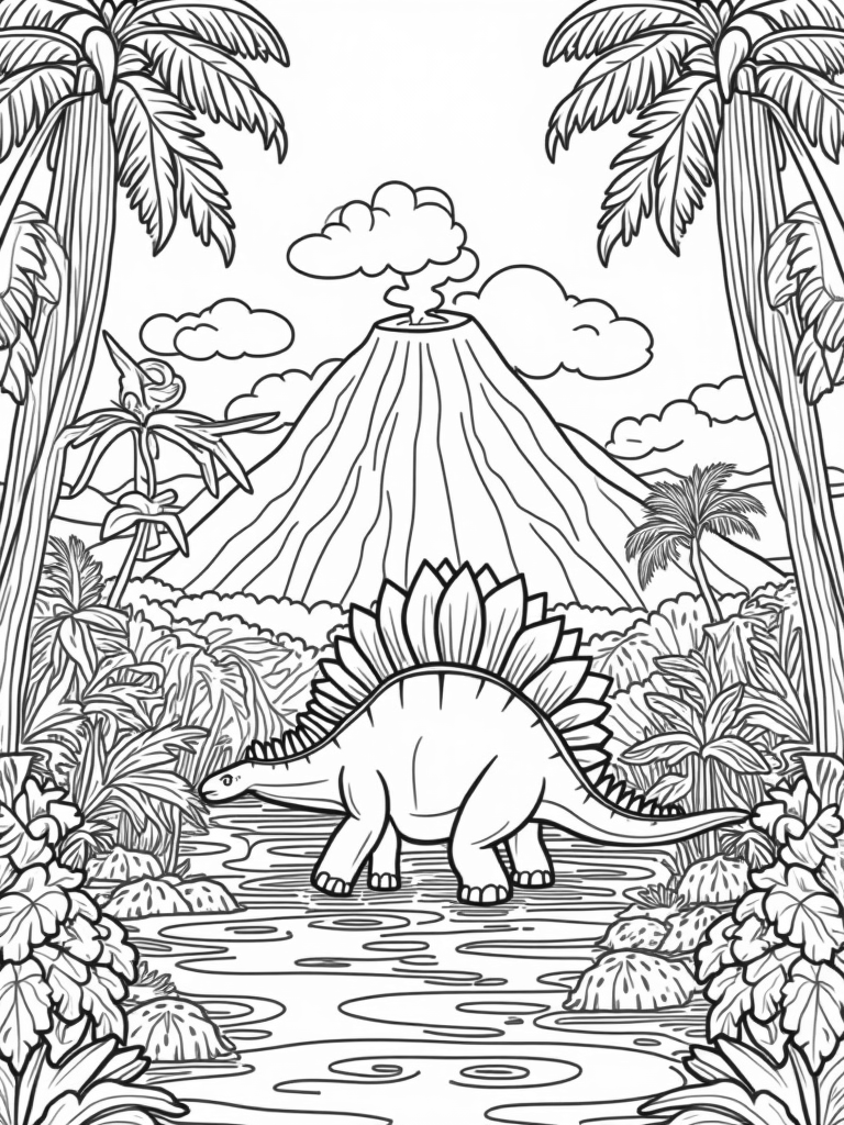 Colossal Stegosaurus in a Lush Prehistoric Jungle Coloring Page