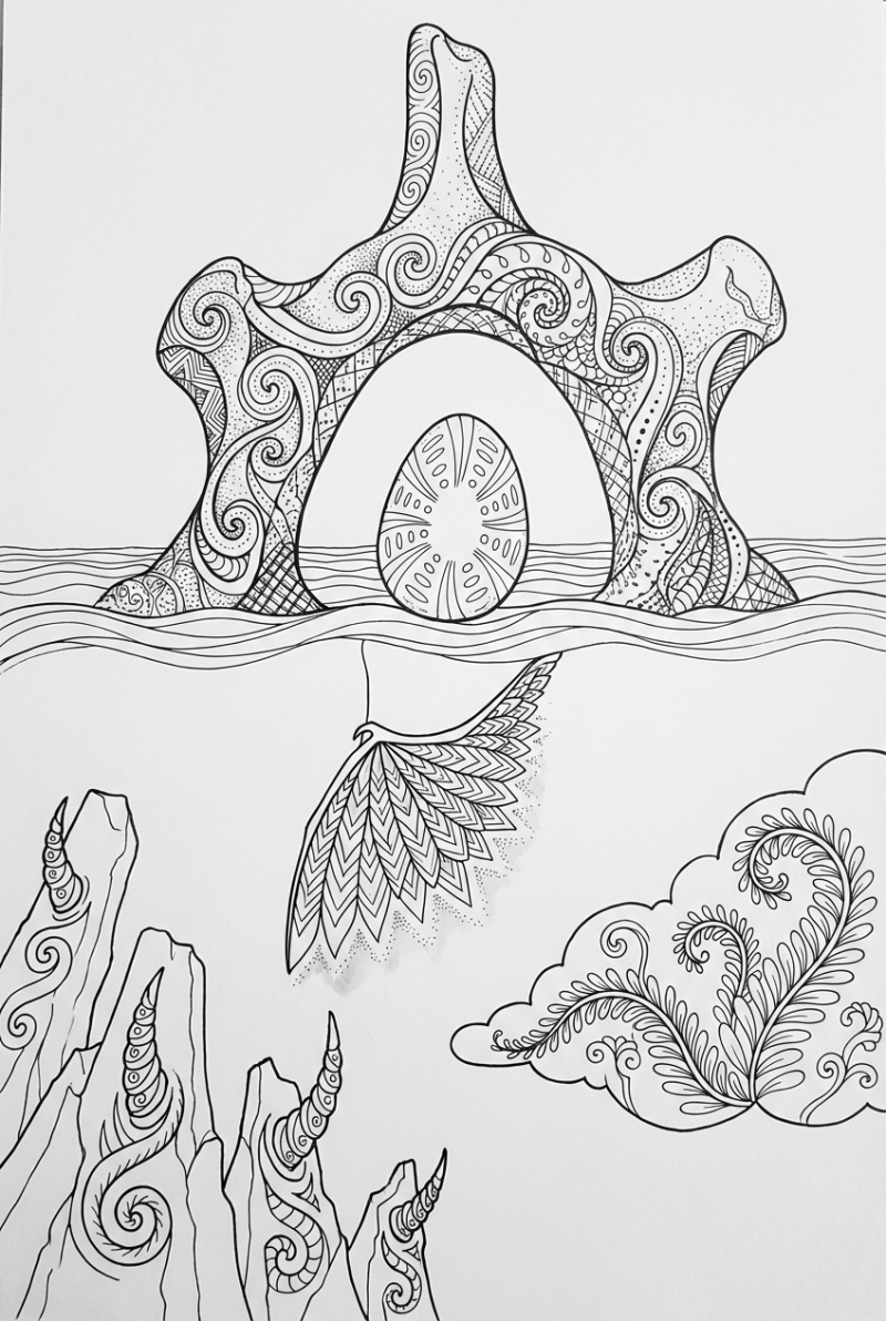 Look at that huge dinosaur vertebra turned into an arch over a twilight lake. Inside the hollow you can see a glowing fossil egg, like a tiny lighthouse. Hanging above the water is a pterosaur wing, acting like a lantern, and along the shore jagged basalt pillars have been carved into triceratops horns. A little fern island floats nearby, its fronds reaching toward the arch. All the lines are clean, zentangle‑style patterns, so there’s plenty of space to add your own colors.