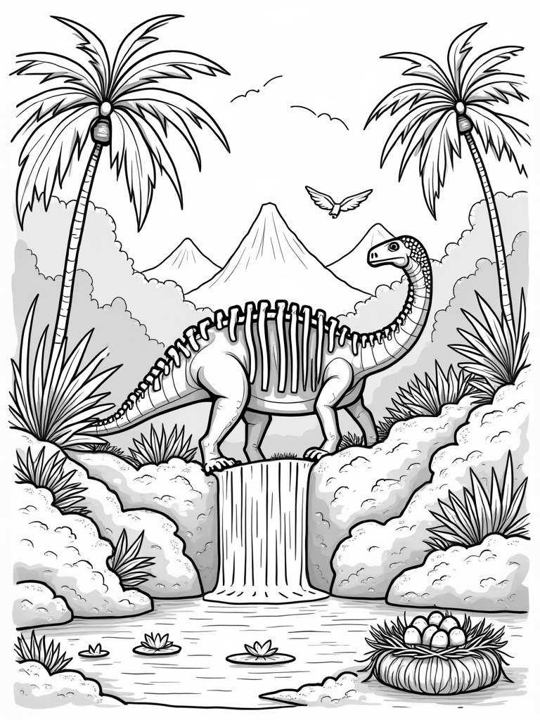 Check out this free, printable coloring page featuring a dinosaur fossil in a lush prehistoric jungle. With a waterfall, colorful eggs, and a flying pterodactyl, it’s perfect for dino lovers and makes for a fun coloring activity!