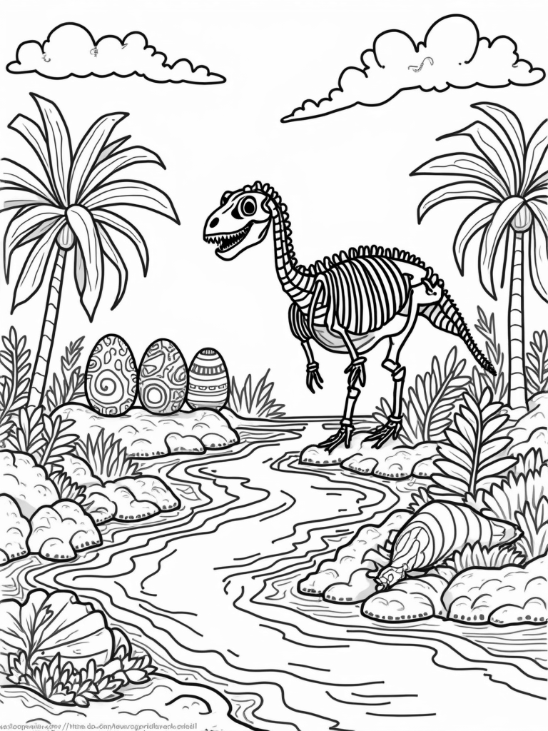 In the center of this vibrant scene, a gigantic dinosaur skeleton arches over a river of flowing lava, creating a striking contrast against the lush greenery of towering ferns and cycads. Nestled among the rocks are oversized dinosaur eggs, each uniquely patterned and bursting with color possibilities. And don’t forget the sky above, where playful pterodactyls glide among fluffy clouds, adding a whimsical touch to this prehistoric paradise.