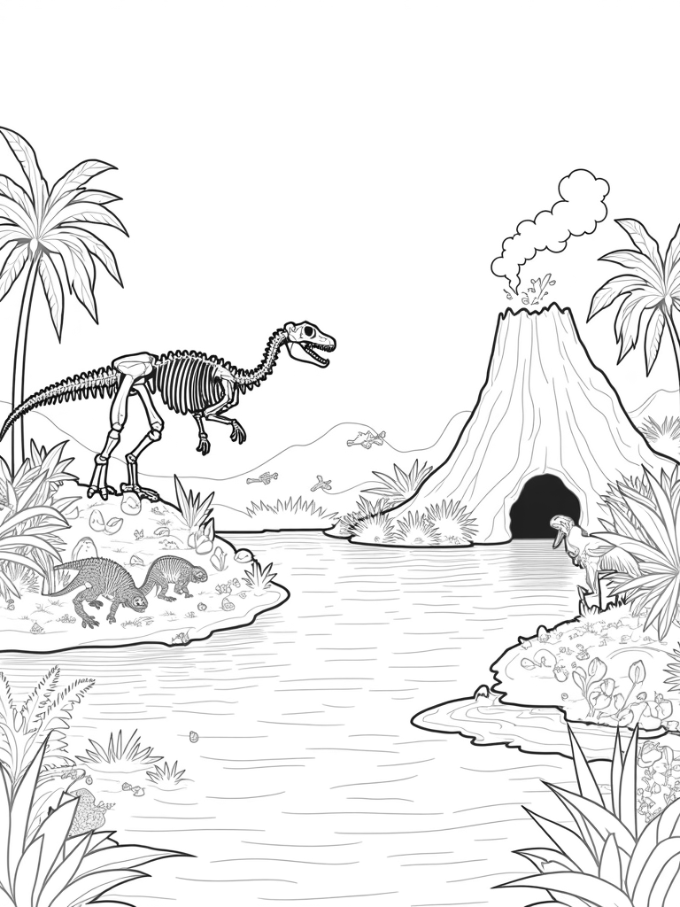 Dinosaur Skeleton in a Prehistoric Jungle Coloring Page